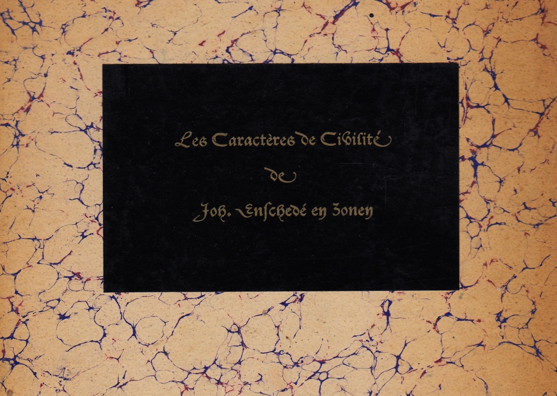 9. (CIVILITÉ). J. van KRIMPEN Spécimen des Lettres françoises, dites Caractères de Civilité des xvjme et xvijme siècles dans la Collection Typographique de Joh. Enschedé en Zonen. Haarlem, Joh. Enschedé en Zonen, 1926. Karton met titeletiket. 40 p. Gezet uit de Civilité (en enkele andere antieke letters) en gedrukt op Hollandsch Vergé van de Koninklijke Papierfabriek Pannekoek (vermelding tegenover de titelpagina). 1e druk. Rugje ontbreekt. Platten flink verbruind.