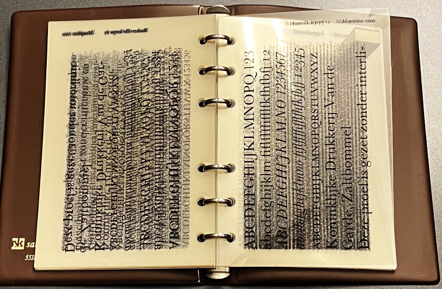 28. (TYPOGRAFIE). GARDE, Koninklijke Drukkerij Van de Letterproef Monophoto. Koninklijke Drukkerij Van de Garde. Zaltbommel, Koninklijke Drukkerij Van de Garde, 1978. 16 x 11 cm. Soepel kunstleer met ringbandje (in de vorm van een jaaragenda). (12; 128) p. De letterproef zelf is op doorzichtige film gedrukt. 1e druk. Keurig.