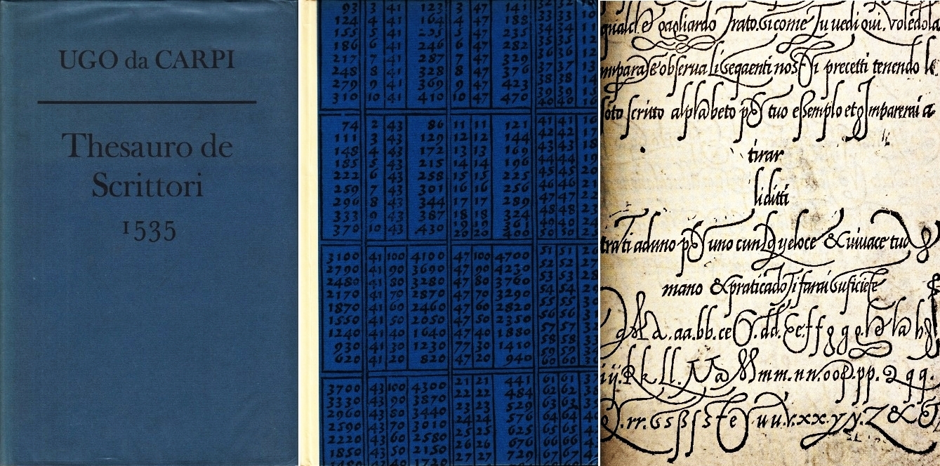 13. (KALLIGRAFIE). CARPI, Ugo da Thesauro de Scrittori. With an introduction by Esther Potter. Londen, Natali & Maurice, 1968. 25 x 16 cm. Perkamentpapieren rug met gedecoreerde blauwe platten en stofomslag van Ingrespapier (in mylar). XVI, 98 p. Facsimile van een gedrukt schrijfboek uit 1535. 1e druk. Mooi exemplaar.