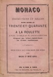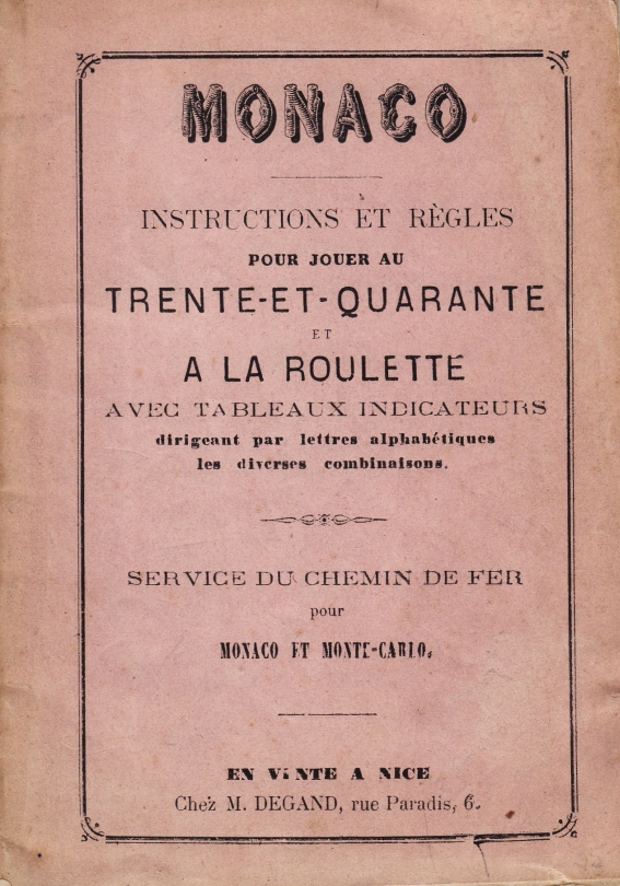 8. CASINO DE MONACO Monaco. Instructions pour jouer au trente-et-quarante et à la roulette, avec tableaux indicateurs dirigeant par lettres alphabétiques les diverses combinaisons. Service du chemin de fer pour Monaco et Monte-Carlo. Nice, M. Degand, ca.1890. 16 x 11 cm. Originele roze omslagen. 32 p. Met twee uitklapbare plattegronden van roulettetafels. Rug wat sleets.