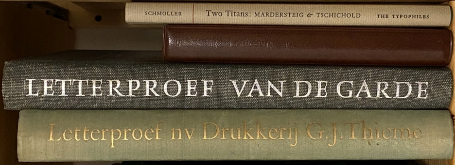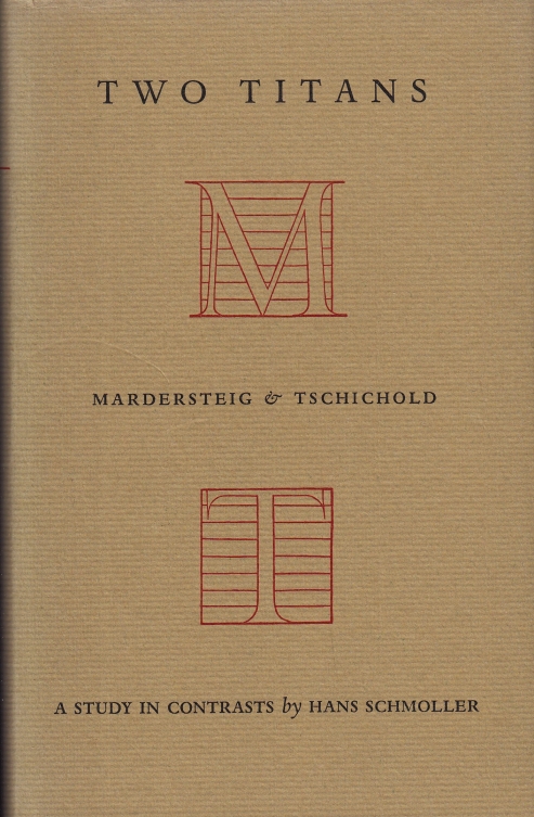 29. (TYPOGRAFIE). SCHMOLLER, Hans Two Titans: Mardersteig and Tschichold. A Study in Contrasts New York, The Typophiles, 1990. Linnen met stofomslag. 80 p. Illustraties, sommige in kleur. Gedrukt door Martino Mardersteig bij de Stamperia Valdonega (Verona) in 1100 exemplaren. 1e druk. Mooi.