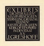 * Met fraai (zwart) exlibris van Jan Greshoff, vervaardigd door zijn vriend en zwager Jan van Krimpen, waarop een lapidaire tekst van Albert Verwey: ‘Dichter alleen? Maar vriend, geen sterveling die u zal steunen! Kies tegelijk u een kerk of een partij in den staat.’ Nummer 4 van de ‘Nieuwe woorden’, voor het eerst gepubliceerd in Verweys literaire tijdschrift De Beweging, januari 1912.