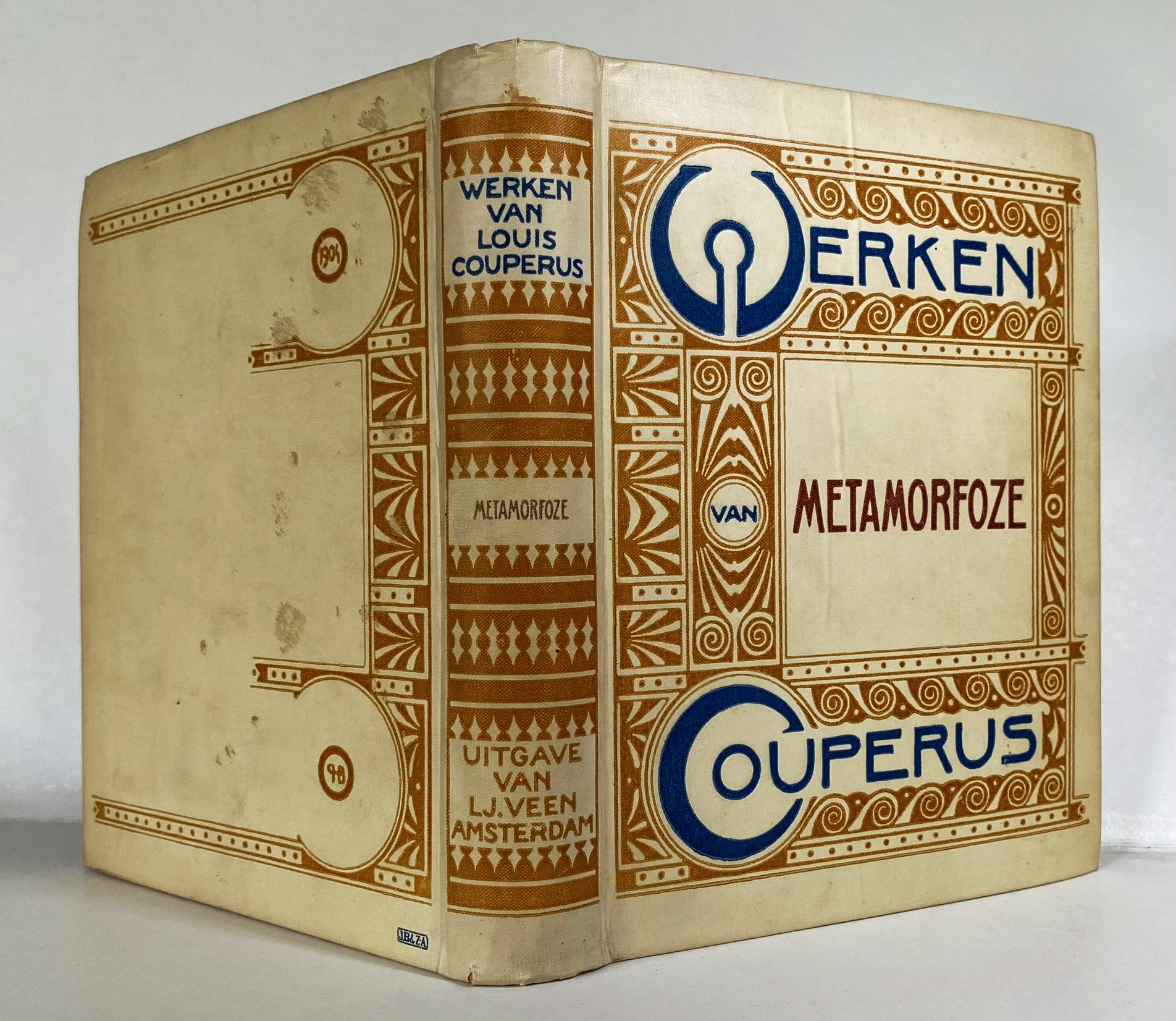 2. COUPERUS, Louis Metamorfoze. Met een Portret door H.J. Haverman. Amsterdam, Veen, [1905]. Linnen (Werken-band [ontwerp H.P. Berlage]). (8), 432 p. 1e druk. Kreukjes in voorplat, wat vage grijze vlekjes op het achterplat, verder mooi.