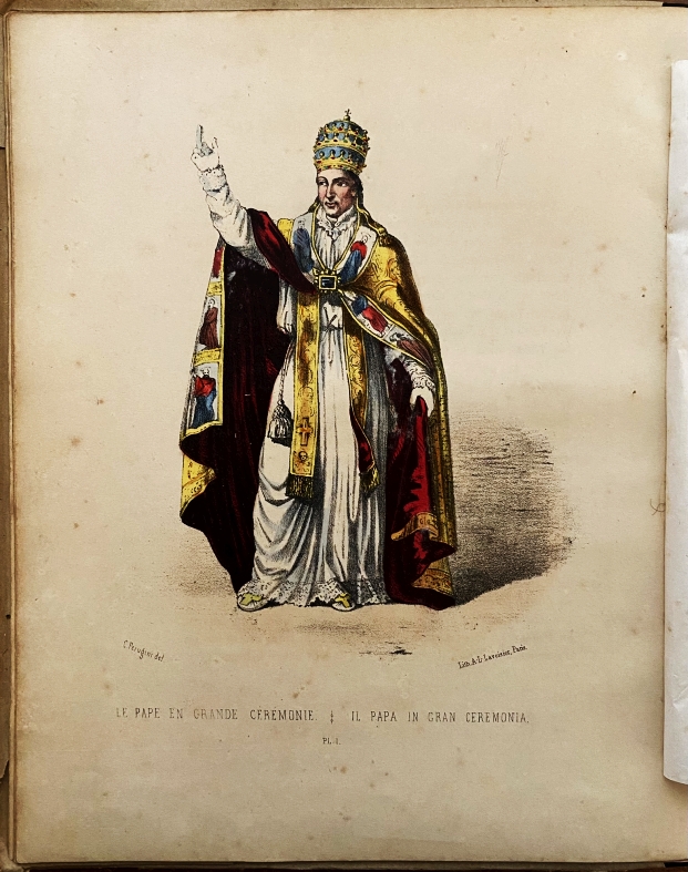 26. (VATICAAN). HELYOT, P. Album ou collection complète et historique des costumes de la Cour de Rome des ordres monastiques, religieux et militaires et des congrégations séculières des deux sexes, contenant 80 figures dessinées et coloriées d’après nature par G. Perugini et accompagnées d’un texte explicatif tiré du P. Hélyot. Paris. Ancienne Maison Silvestre, E. Camerlinck, 1862. 28 x 23 cm. Origineel halflinnen met portret van paus Pius IX. (144) p. Met 80 handgekleurde platen van de officiële Vaticaanse kostuums. 2e druk. Band versleten en eenvoudig gekaft door Wim Zaal. Wat gebruikssporen. Oud stempel van het Zouavenmuseum te Oudenbosch. Roestig en vlekkig.