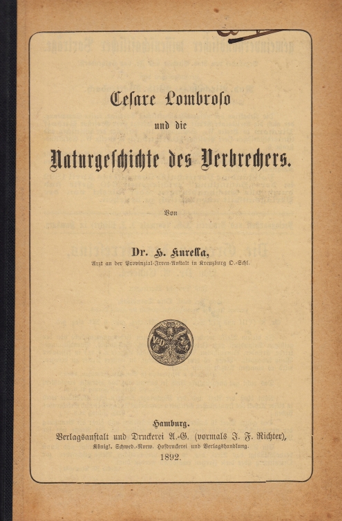 9. KURELLA, H. Cesare Lombroso und die Naturgeschichte des Verbrechers. Hamburg, Verlagsanstalt und Druckerei AG (vormals J.F. Richter), 1892. Halflinnen met gebruikmaking van het originele omslag. 52 p. 1e druk. Merkje van boekhandel “Het Uithangbord ” C.M. Remigius voorheen Dhuij te Middelburg. Goed exemplaar.