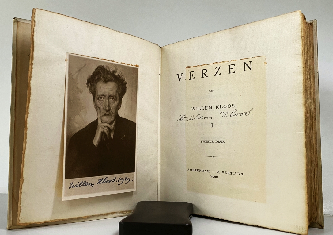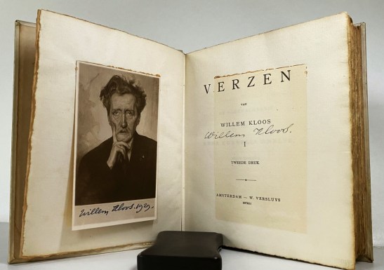 * Op de titelpagina breeduit door Willem Kloos gesigneerd. Daartegenover is een fotoportret geplakt met het portret van Kloos door Antoon van Welie, eveneens gesigneerd door Kloos en door hem gedateerd ‘1929’.
