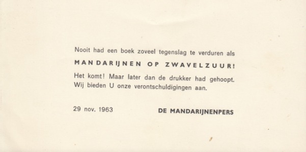 * ‘Nooit had een boek zoveel tegenslag te verduren als/ Mandarijnen op zwavelzuur!/ Het komt! Maar later dan de drukker had gehoopt (…)’. Naar onze mening een zelfstandige publicatie van Hermans!