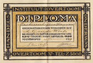 * Typediploma voor de latere schoonmoeder van Huib van Krimpen, Gellandina van der Woude (1900-1965). Prachtig uitgevoerd in een krullige stijl tussen jugendstil en art deco.