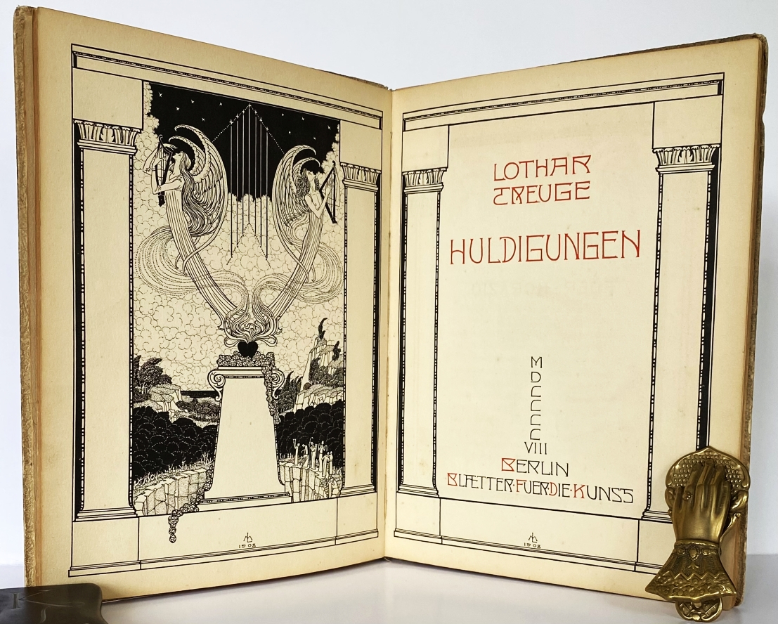 34. TREUGE, Lothar Huldigungen. (Met boekversiering en typografie van Melchior LECHTER). Berlin, Blaetter fuer die Kunst, 1908. 32 x 25 cm. Karton bekleed met verguld naturel ruig geschept papier (‘gefüttertes rauhes Japanpapier’ aldus het colofon). (64) p. Gedrukt in rood en zwart in een oplage van 210 genummerde exemplaren. Picturaal frontispice, boekversiering en typografie van Melchior Lechter. Alle tekstbladzijden in monumentaal zuilenkader. 1e druk. Rug licht beschadigd en iets versleten. Boekband verdonkerd. Hakje in achterrand. Schutbladen met lichte gebruikssporen. Binnenwerk goed.