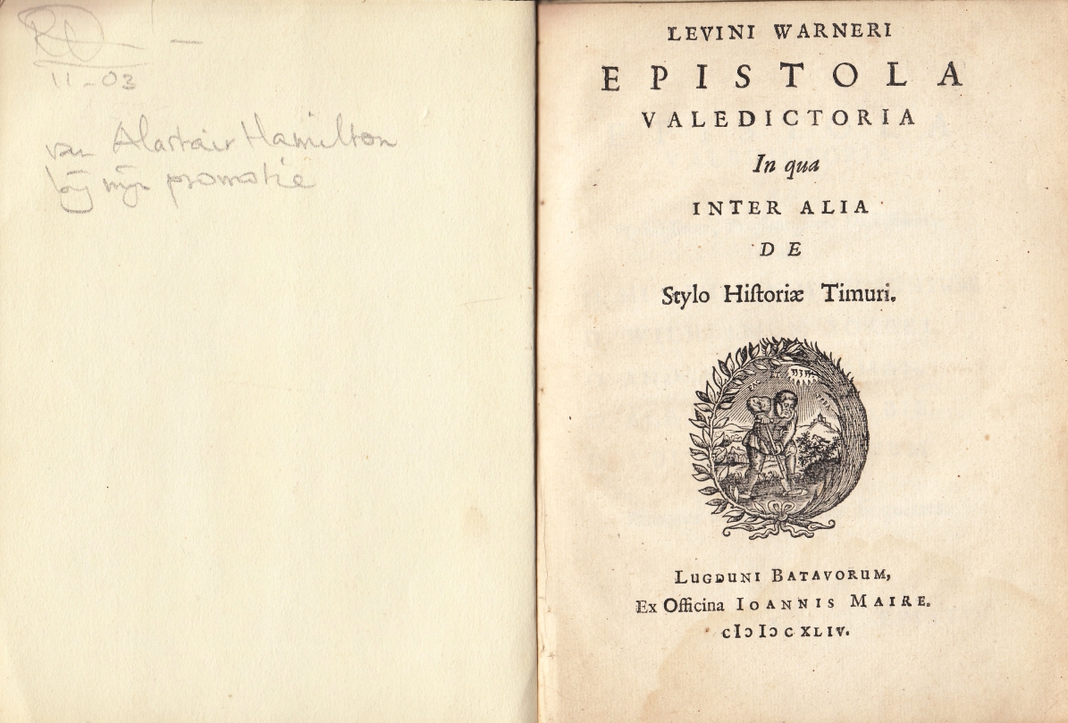 * Letterlijk: ‘Een afscheidsbrief waarin onder meer over de stijl van de geschiedenis van Timur’ (de wrede 13e-eeuwse Mongoolse veroveraar, ook bekend als Tamerlan). Dit boekje werd (blijkens de potloodinscriptie voorin) door de in Nederland werkzame hoogleraar Alastair Hamilton aan Ronald BREUGELMANS gegeven bij diens promotie in 2003. Breugelmans promoveerde op een bibliografie van Joannes Maire.