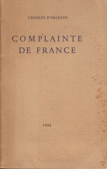 28. ORLÉANS, Charles d’ Complainte de France. (Rosières, Picardie, Pierre Mangart [= Den Haag, A.A.M. Stols]), 1944. Ingenaaid. (12) p. Gedrukt op Hollands papier in een oplage van 100 genummerde exemplaren op geschept velijn-papier van Van Gelder. 1e druk. Omslag met bruine vlekken.