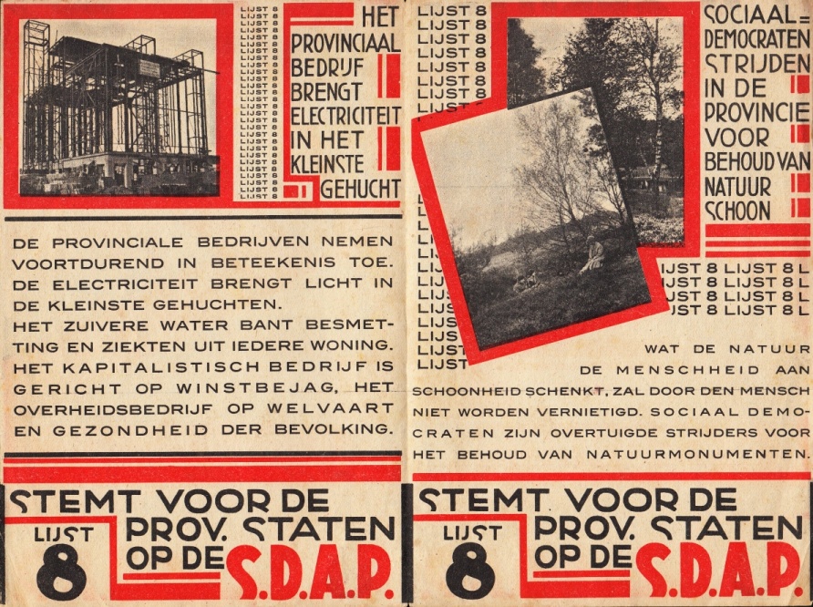 * Indrukwekkend politiek verkiezingswerfstuk voor de Provinciale Statenverkiezingen van Noord-Holland, die gehouden werden in april 1931. Met afbeelding van Sanatorium Zonnestraal in Hilversum, een jeugdherberg, een elektriciteitscentrale, stukjes natuur – en een portret van de Veteraan-Lijstaanvoerder Adriaan Gerhard (1858-1948).