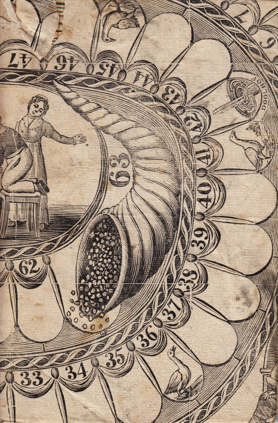 30. REISDAGBOEK VAN EEN NUCHTERE VROUW Journaal van eene Reis door Braband na den Rhijn in den Jare 1824. (Handgeschreven verslag). Schrift van geschept papier met stijfselgedecoreerd omslag, gekaft met een ganzenbordspel uit de vroege 19e eeuw. 40 p., dichtbeschreven met bruine inkt in een regelmatig handschrift, ca. 27 regels per pagina. De staat is in het algemeen goed, maar in het midden zijn wat vochtvlekken opgetreden die sommige woorden hebben weggevaagd. Maar het verhaal is daar nergens ernstig door getroffen.