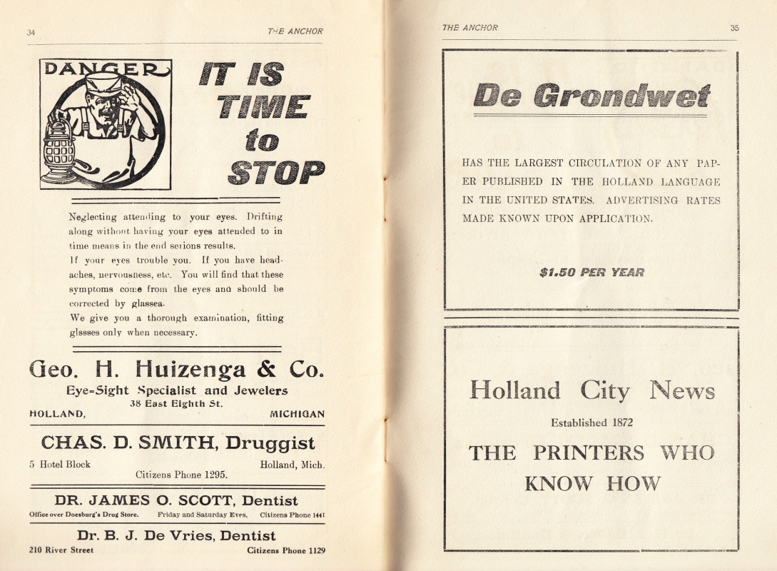 * Dat zie je niet vaak: een publicatie uit het in 1847 door Nederlanders gestichte plaatsje in Michigan, het blad van Hope College, een Preparatory School annex School of Music, en het Western Theological Seminary maakte er ook deel van uit. Met veel advertenties vol Nederlandse namen: Boter, Barkema, Lokker, Rutgers, Huizenga en De Vries. En dan heb je nog redacteurs als Pasma, Pikaart, Schwitters, Vis, Stronks en Heemstra. Met een artikel van Henry V.E. Stegeman en een verslag van een aantal succesvolle sportwedstrijden (met afbeelding van het winnende team, waarin we namen zien als Stegeman, Warnshuis, Abbink en Vruwink). De verschijning van het boek De Tawl van Philip Dröge was aanleiding om deze publicatie op te nemen, maar helaas wordt er geen Nederlands woord in gebruikt.