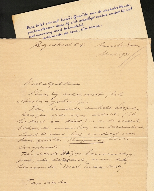 42. QUERIDO, Is. Handgeschreven brief aan ‘WeledGeb Heer’ (‘F.C.M. Lampe, Directeur Postkantoor te Scheveningen’). Gesigneerd ‘Is. Querido’ en gedateerd ‘Rijnstraat 54. Amsterdam/ Maart 1931’. Met toebehoren in originele envelop (postzegels verwijderd).