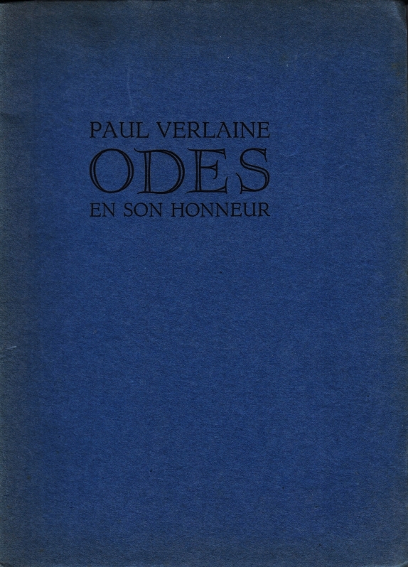 23. VERLAINE, Paul Odes en son honneur. Paris, La Connaissance, 1931. 28 x 20 cm. Original blue wrappers. (48) p. With original portrait etching by Paterne Berrichon. Set from the Hollandsche Mediaeval printed in red and black in 100 numbered copies on wove paper of Van Gelder. Sellotape ghost at the flyleaves.