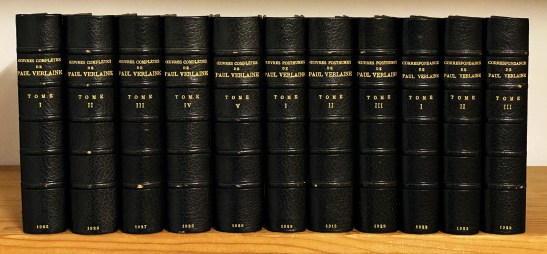25. VERLAINE, Paul Oeuvres complètes (5 vols; 1925-1927). Oeuvres posthumes (3 vols; 1913-1929). Correspondance (3 vols; 1922-1929). Exemplaires de tête. Paris, Albert Messein, 1913-1929. Complete in eleven volumes. Gilt black halfmorocco with five ribbons and marbled boards, top edges gilt, marbled endpapers, original wrappers and backstrips bound in (Charles Septier). Bookplate of Bouessée Larchamp on flyleaves. A few inconspicuous scratches on some of the spines, but a very nice set.