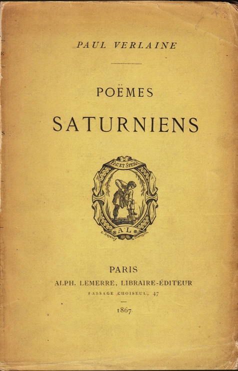 33. VERLAINE, Paul Poëmes Saturniens. Paris, Alphonse Lemerre, 1866 (on cover: 1867). Original wrappers. (8), 164 p. 1st edition. Modest bookplate on p. (6), lower cover loose, spine damaged and broken in some places (but not loose), first and last endpaper foxed.