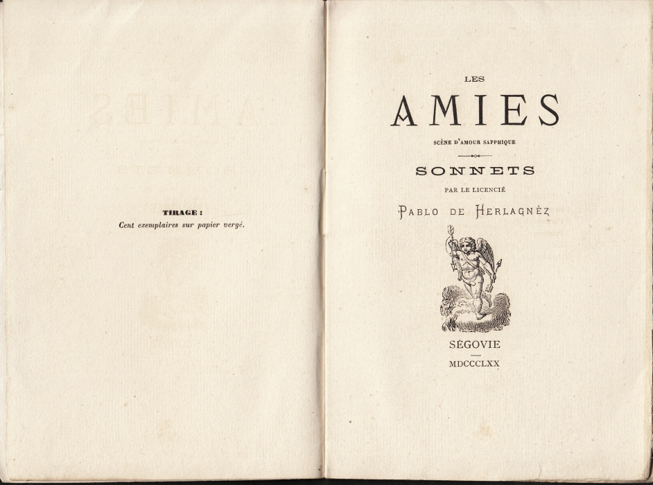 2. [VERLAINE, Paul] Les amies. Scène d’amour sapphique. Sonnets par le licencié Pablo de Herlangèz. Ségovie, 1870. Original! grey unprinted wrappers. 16 p. Printed in 100 copies on laid paper. Unopened copy, cover very slightly soiled.
