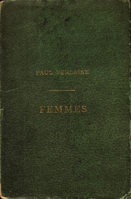 13. VERLAINE, Paul Femmes. ‘Imprimé sous le manteau et ne se vend nulle part’ [= Paris /London, C. Hirsch, 1895]. Green paper wrappers. 72 p. Uncut. Printed in an edition of 500 numbered copies. [2nd edition]. Spine damaged, figure with ballpoint pen on page 4.