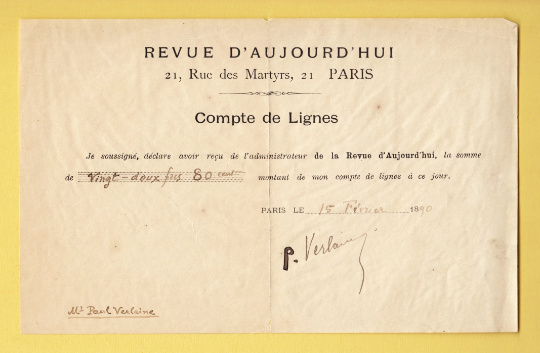 * Pre-printed receipt from La Revue d’Aujourd’hui. Oblong 13.5 x 21.5 cm. On February 15, 1890, Verlaine received 22 francs and 80 centimes from the magazine. The date and amount were entered by someone from La Revue d’Aujourd’hui, who also wrote ‘Mr Paul Verlaine’ at the bottom left of the note. Two poems by Verlaine were included in La Revue d’Aujourd’hui of February 1890, later collected in Bonheur (1891).
