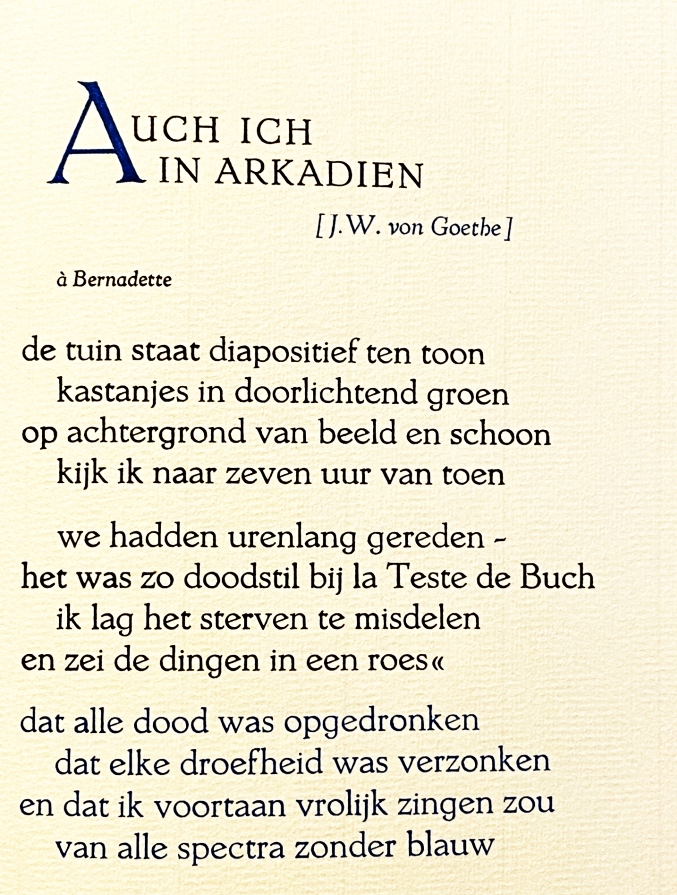 3. BÜCH, Boudewijn Auch ich in Arkadien. (Gesigneerd door de dichter). Sub Signo Libelli, 1980. Vouwblad in blauw omslag. Gedrukt in zwart en blauw in een oplage van 60 genummerde exemplaren. 1e druk. Gaaf.