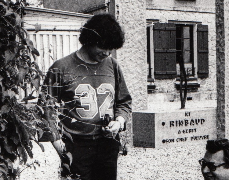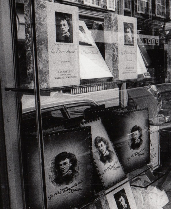 * Mooie foto van een vitrine met boeksimulanten met een portret van Rimbaud erop (‘Je suis jeune/ Tendez moi la main!’), gevuld met Rimbaudchocolaatjes. Aan het eind van de straat is het Musée Rimbaud zichtbaar. In mei 1981 bezochten Boudewijn Büch en Klaas Koppe Charleville en Roche, de twee plaatsen in de Franse Ardennen waar Rimbaud gewoond heeft. Dat resulteerde onder meer in een artikel voor Het Parool en een radiouitzending voor de KRO. Deze foto is afkomstig uit de nalatenschap van Boudewijn Büch. De afbeelding hier rechts is slechts een kleine uitsnede.