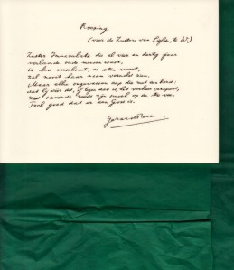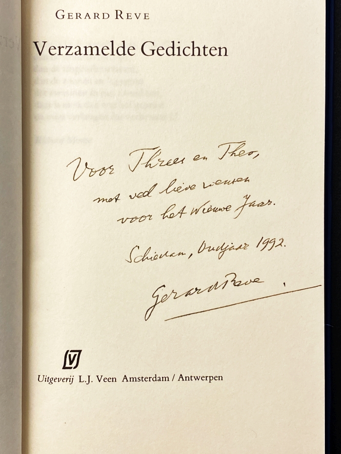 * Exemplaar met handgeschreven opdracht van de auteur op de titelpagina: ‘Voor Threes en Theo [Moolhuysen-Coenders],/ met veel lieve wensen/ voor het Nieuwe Jaar./ Schiedam, Oudjaar 1992./ Gerard Reve.’