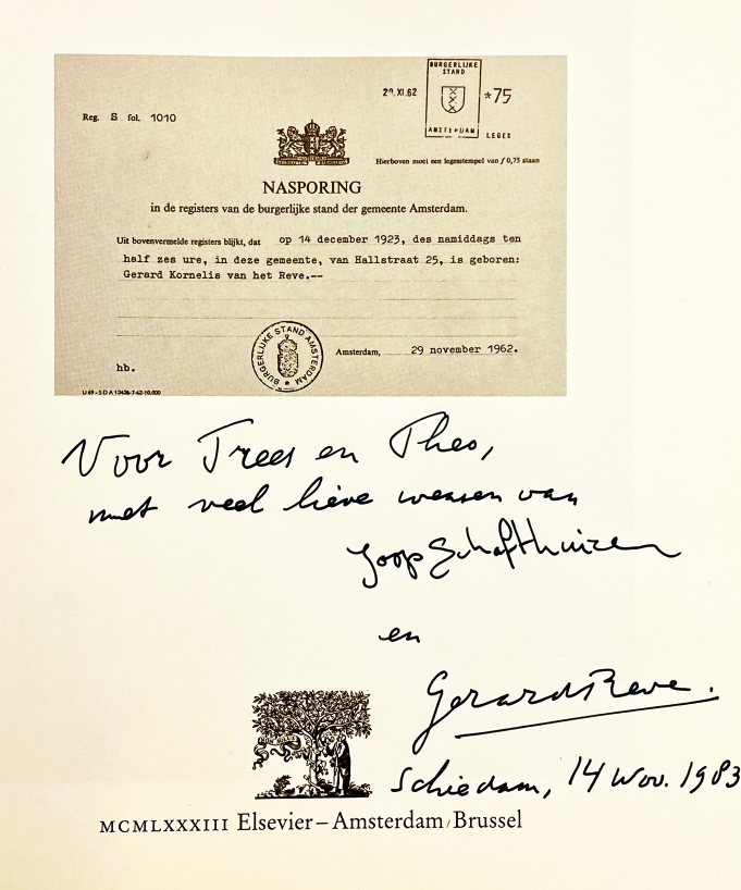 * Exemplaar met handgeschreven opdracht van de auteur op de titelpagina: ‘Voor Trees en Theo [Moolhuysen-Coenders],/ met veel lieve wensen van/ Joop Schafthuizen/ en/ Gerard Reve/ Schiedam, 14 Nov. 1983’. Schafthuizen schreef zelf zijn naam in de opdracht.