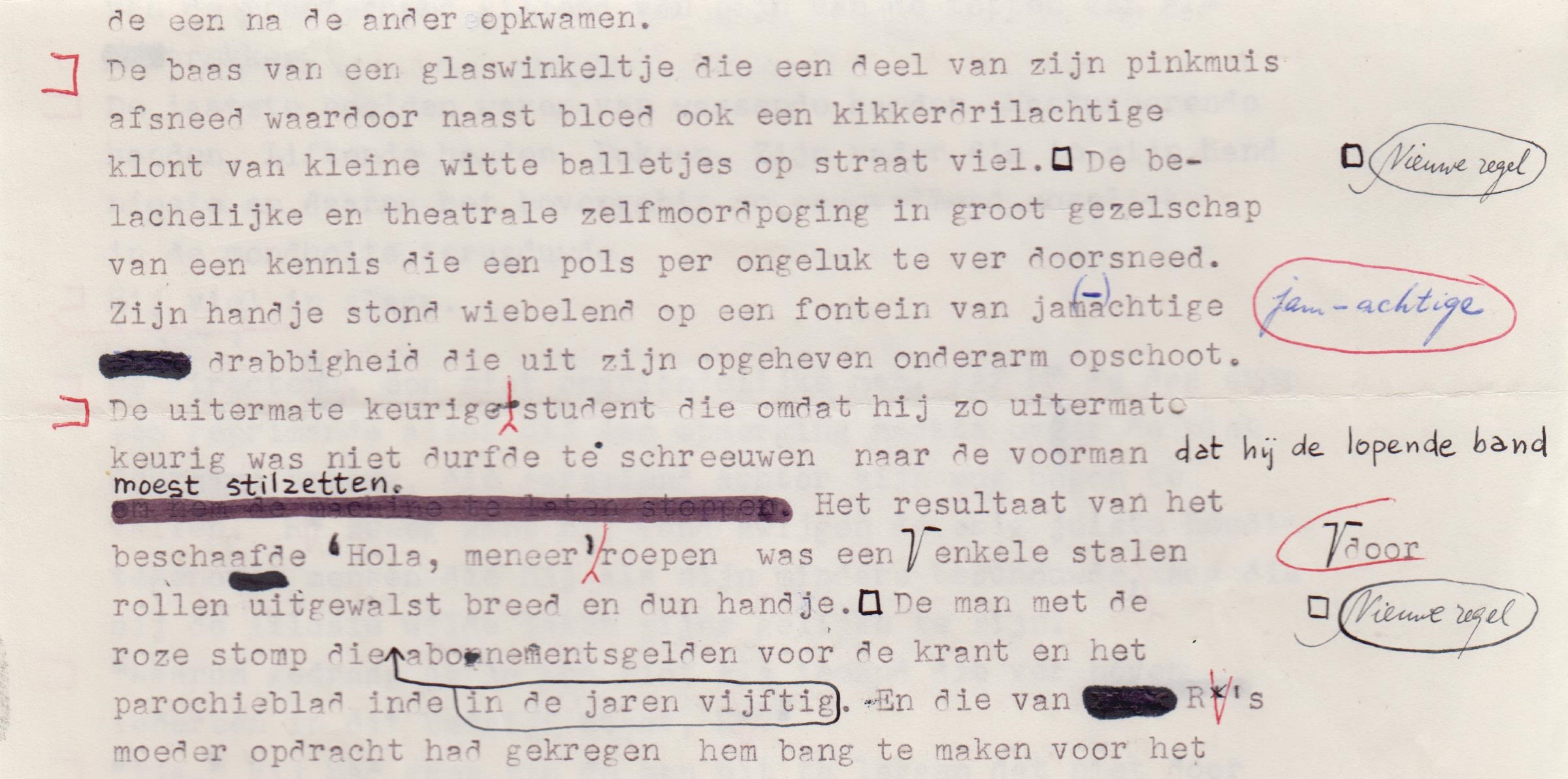* Tamelijk doorleefd, herhaaldelijk bewerkt typoscript van dit vroege verhaal, dat in 1973 zou worden gepubliceerd in Maatstaf. Blijkbaar leverde Loesberg het titelloos in, want Maatstafredacteur Mensje van Keulen schreef er de titel ‘Vuurwerk’ boven. Die werd vervangen door ‘Robert Loesberg Gelukkig Nieuwjaar’. Het typoscript bevat vooral veel met zwart stift doorgehaalde regels, die met moeite toch nog te lezen zijn.