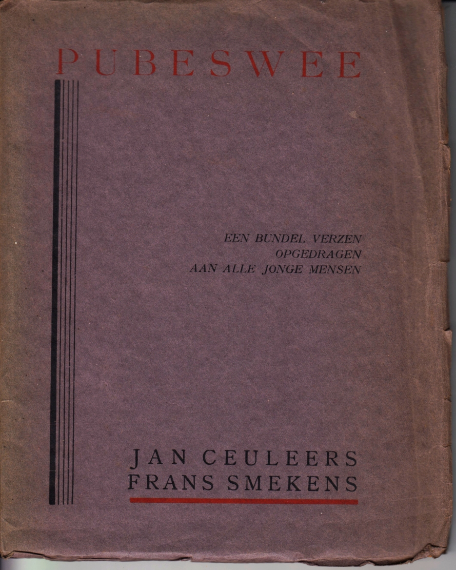 8. CEULEERS, Jan, & Frans SMEKENS Pubeswee. Een bundel verzen opgedragen aan alle jonge mensen. (Antwerpen, eigen beheer, 1931). 22 x 18 cm. Ingenaaid. 64 p. Gedrukt op ‘zwaar editiepapier’ in 150 genummerde exemplaren. Omslag gekreukt en flapperig. Tekstpapier bruin.