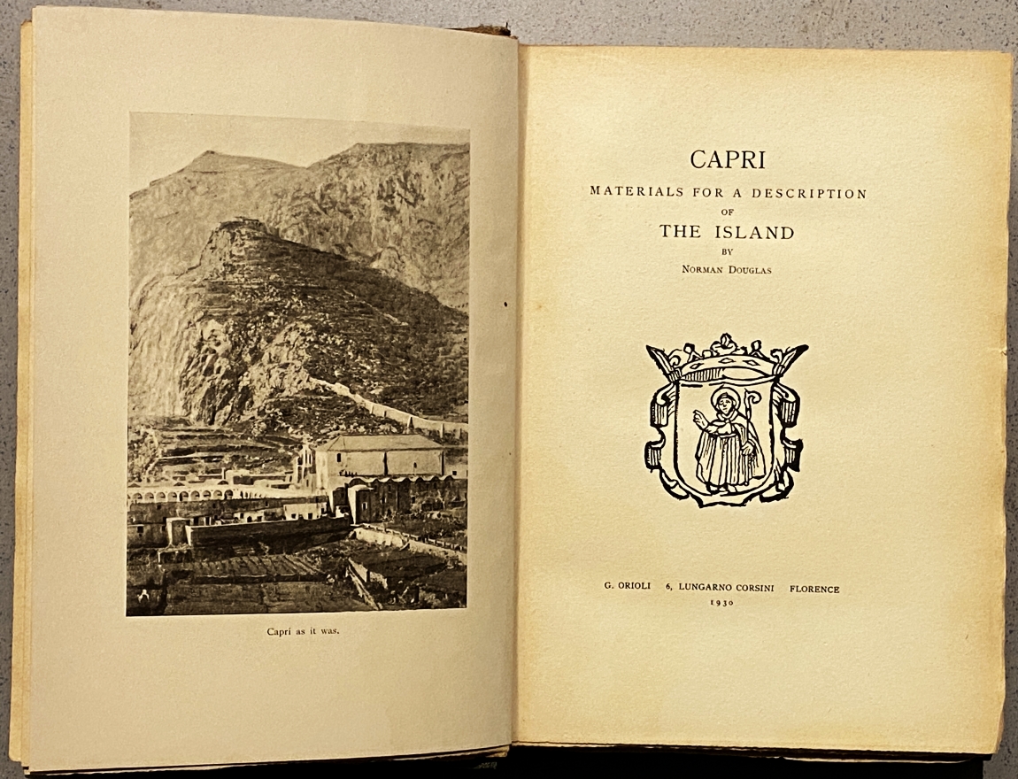 * Zeer informatief over Capri in de vroege 20e eeuw in de sfeervolle en precieze stijl van oude deugniet Norman Douglas. In druk opgedragen aan zijn maatje Compton Mackenzie, auteur van sensationele romans over Capri. Een zwaar en niet erg degelijk gemaakt boek dat in goede staat niet te vinden is.