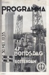 * Fraaie fotomontage van De Hef, de oude St. Laurens en moderne fabrieken met letters en wapentjes van de hand van de verder als kunstenaar onbekende Brandenburg (geb. 1909?). Omvangrijk programma met uitvoerige toelichting over de stad Rotterdam, maar ook over het orgel in de Nieuwe Zuiderkerk, en met liedteksten zoals het ‘Meisjesbondslied’ en ‘Houdt het jonge leven rein!‘ (‘Laat geen passiestormen woeden!’).