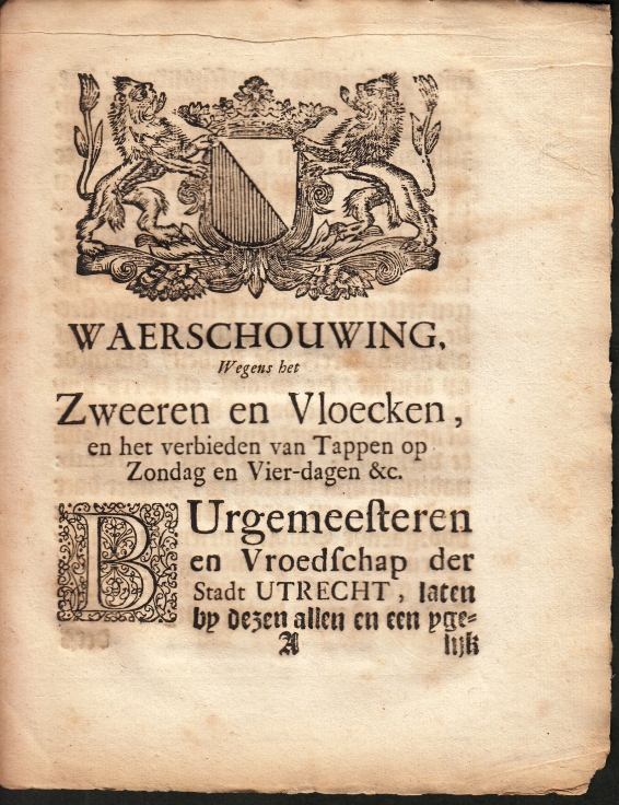 31. UTRECHT Waerschouwing wegens het Zweeren en Vloecken, en het verbieden van Tappen op Zondag en Vier-dagen &c. Utrecht, Jacob van Poolsum, 1723. Vouwblad. Met groot wapenschild, door twee leeuwen gefrankeerd, en initiaal B. Voornamelijk gotische letters. Wat verbruind.