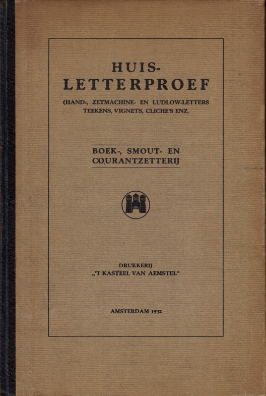 21. LETTERPROEF Huis-Letterproef (Hand-, zetmachine- en Ludlow-letters teekens, vignets, cliche’s enz.) Boek-, Smout- en Courantzetterij Drukkerij ’t Kasteel van Aemstel, Amsterdam. Amsterdam, Drukkerij ’t Kasteel van Aemstel, 1932. Halflinnen met origineel omslag opgeplakt. 220 p., enkele grote letters op uitslaande bladen. Vele afbeeldingen van grote en kleine letters (van 6 punt tot 64 cicero), lijnen, vignetten en cliché’s. Nette conditie.