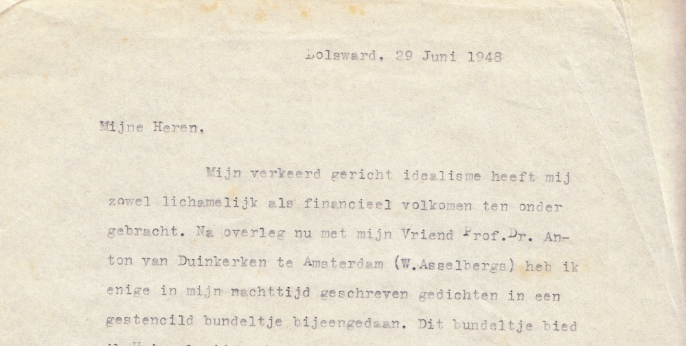 * Bijgevoegd: Getypte brief aan ‘Mijne heren’. Typoscript in doorslag. gesigneerd in potlood en gedateerd ‘Bolsward, 29 Juni 1948’. ‘Mijn verkeerd gericht idealisme heeft mij zowel lichamelijk als financieel volkomen ten onder gebracht. Na overleg met mijn Vriend Prof.Dr. Anton van Duinkerken te Amsterdam (W. Asselbergs) heb ik enige in mijn nachttijd geschreven gedichten in een gestencild bundeltje bijeengedaan. Dit bundeltje bied ik U in al zijn schamelheid aan. Uw barmhartigheid inroepend. Ik vind het verschrikkelijk op deze wijze te moeten handelen, maar er is voor mij geen andere uitweg’. Jan H. Eekhout mocht vanwege zijn nazi-verleden niet meer officieel publiceren, vandaar deze in eigen beheer verspreide bundel. Schrijnend.