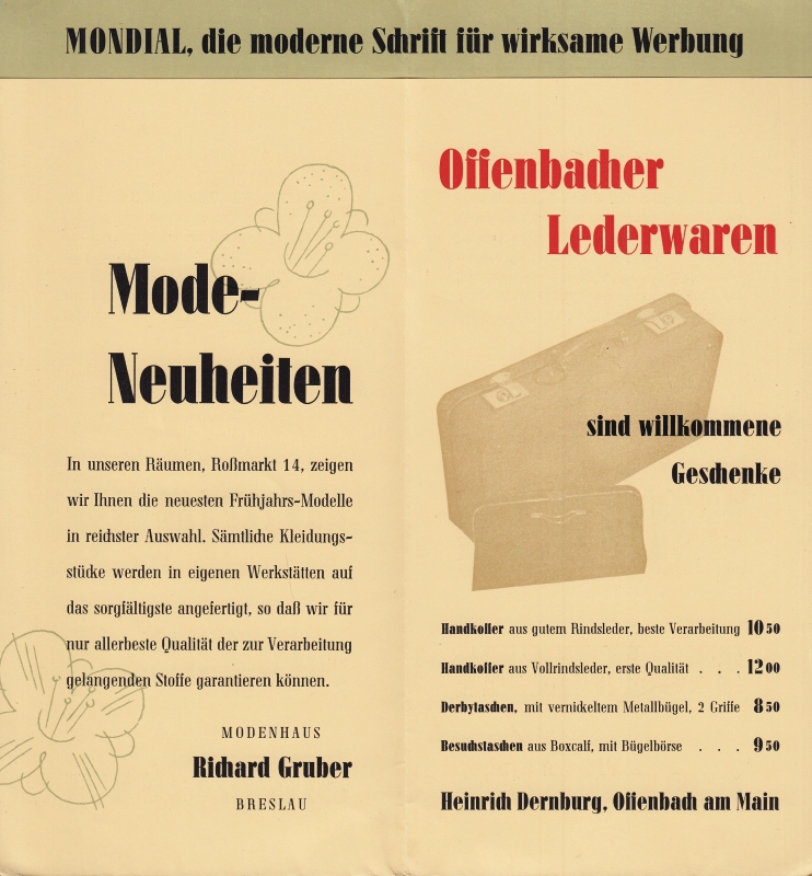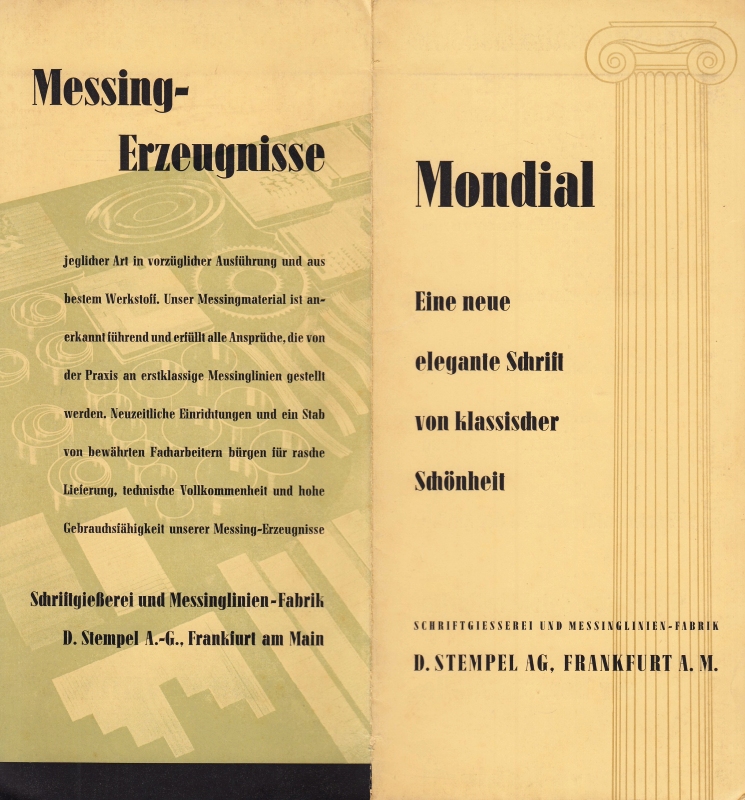 * Showfolder voor de door Max Bohn ontworpen, verticale letter Mondial in smalvet, mager en halfvet met voorbeelden in de vorm van advertenties. Ook met reclame voor messinglijnen om in de zetterij te gebruiken.