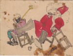 * Niet onverdienstelijke, studentikoze tekening door Belcampo van inkt en waterverf: Sinterklaas en Zwarte Piet aan de drank! Zwarte Piet is in slaap gesukkeld, terwijl de Sint – al pijprokend – van zijn stoel dreigt te vallen. Waarschijnlijk gebruikt ter decoratie van een Sinterklaascadeautje.