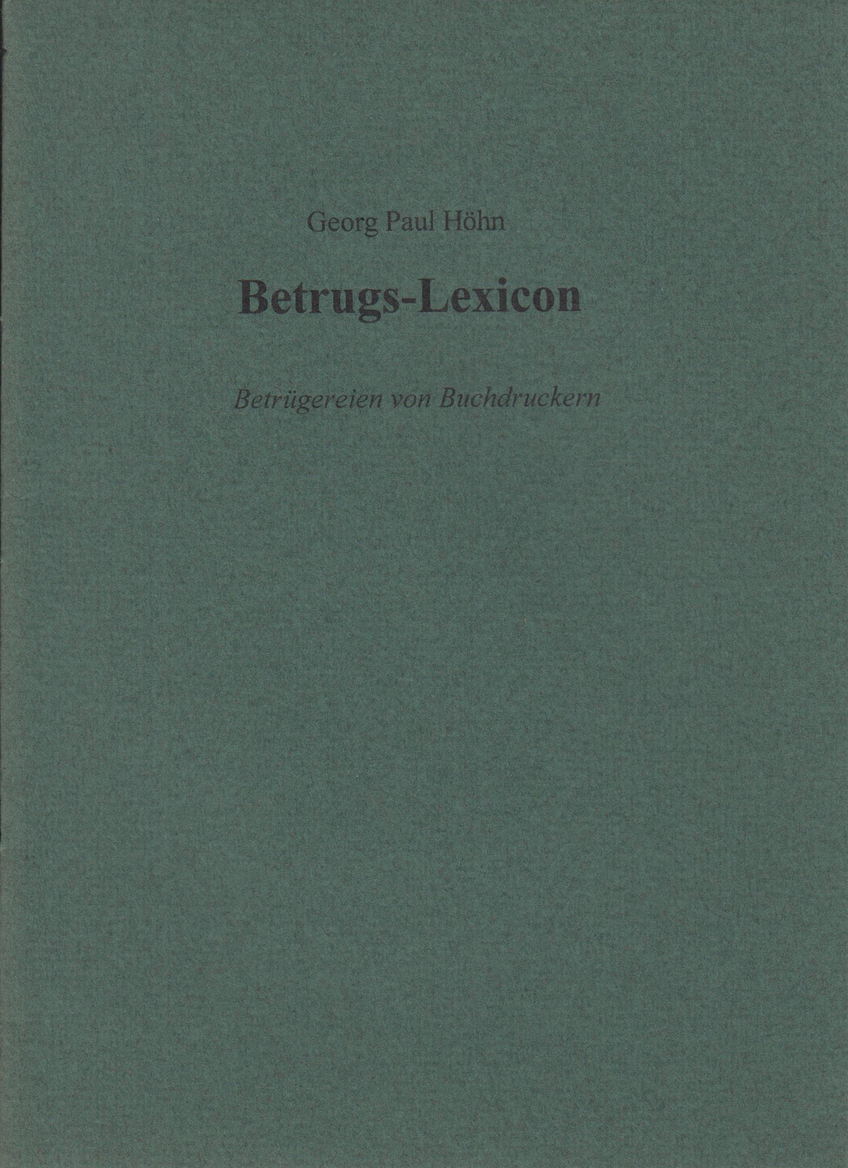 34. HÖHN, Georg Paul Betrugs-Lexicon. Betrügereien von Buchdruckern. Brakkerwoude [= Zoeterwoude], Firma List en Bedrog [De Uitvreter], 2001. Cahiersteek. (4) p. In het Duits (behalve het colofon). Vervaardigd in een oplage van 20 genummerde exemplaren.