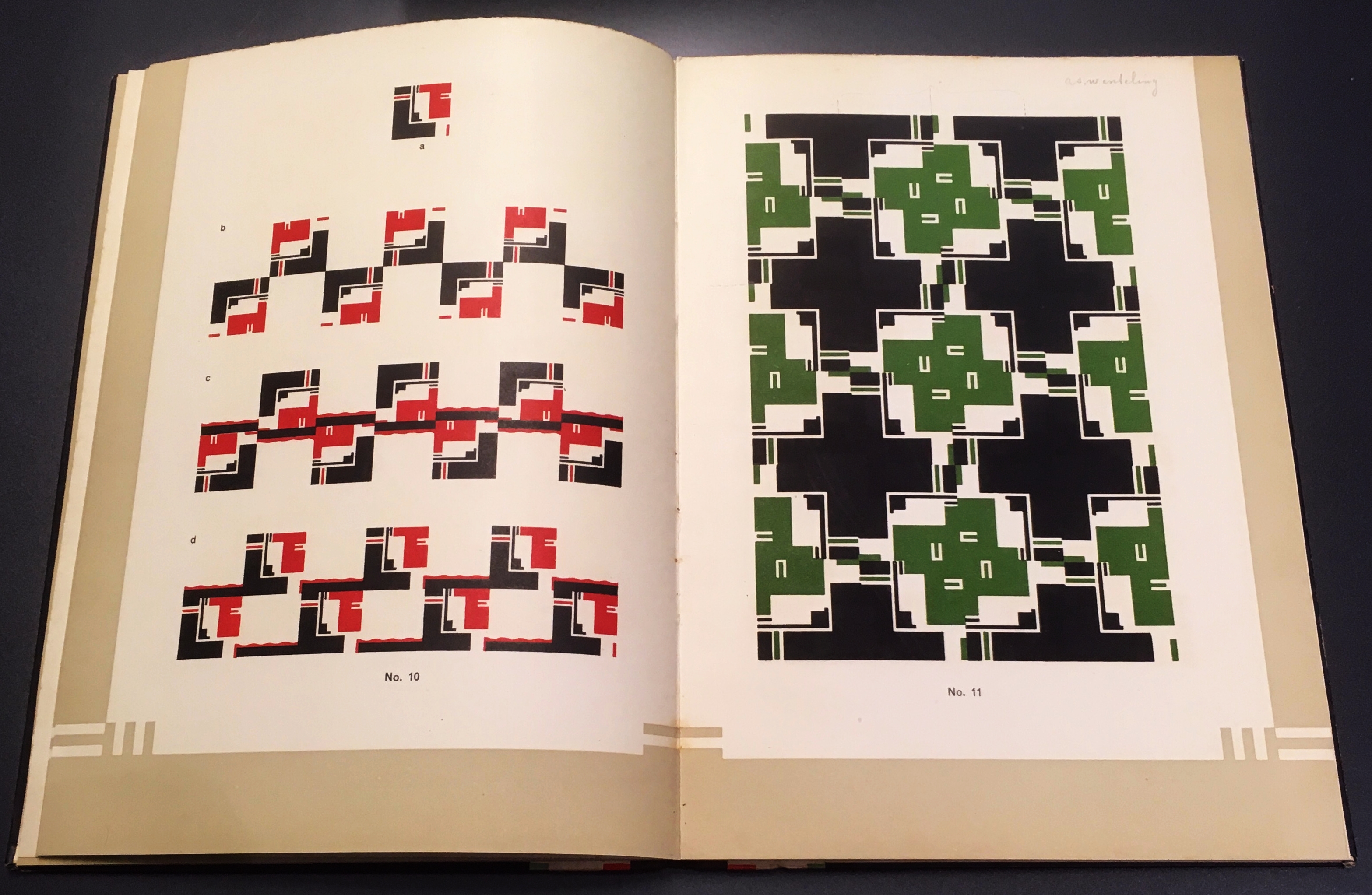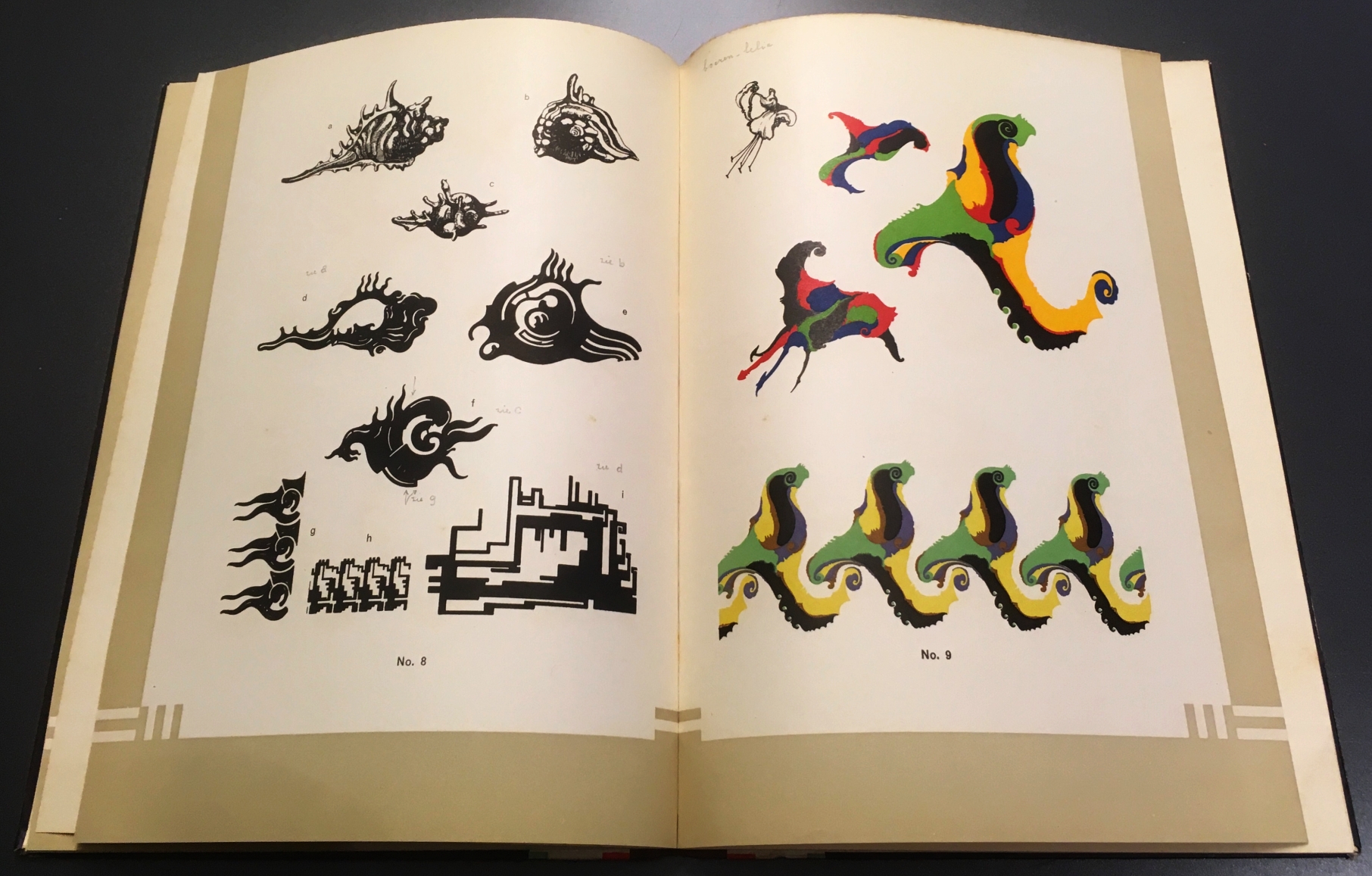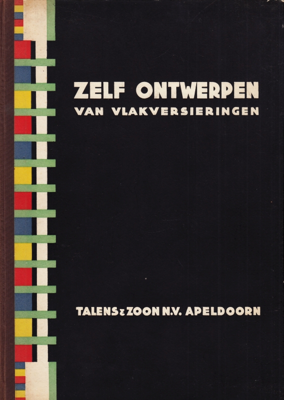 49. LERVEN, G.J. van Zelf ontwerpen van vlakversieringen. Apeldoorn, Talens & Zoon, [1928]. 28 x 20 cm. Halflinnen. 26 bladen, waarvan 24 eenzijdig bedrukt. Kleurrijke art deco-ontwerpen in decoratieve grijze rand. Met een tekstboekje eveneens met decoratieve randen (16 p.). 1e druk. Heel geringe slijtspoortjes op de achterkant.