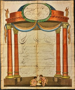26. FEESTDOCUMENT Geertrui Barbara NEURDENBURG Vreugdebetuiging in de vorm van een handgekleurde tekening met de datum ‘1 December 1821’, waarschijnlijk voor de verloving van Johannes Gerardus Verbeet met Geertrui Barbara Neurdenburg te ‘s-Hertogenbosch. Zonder uitgever of plaats. Een zuiltrommel is bekroond met een schild waarop ‘G:B./ Neurdenburg/ 1 December/ 1821’ is geschreven tegen een donkergroene achtergrond. Daartegen leunen twee harten met een pijl erdoor. Aan de voet van de zuil staat een duivennest met twee kuikens erin, naast twee witte duiven die elkaar kussen. Daaromheen decoratieve planten: een kersenboom, loof en wijnranken met opkomende zon, en daar weer omheen een krans van allerlei bloemen en bladen. 28,5 x 21 cm. Dit blad is op een ander blad geplakt, een stuk van een grote, vrome lithografie uit de eerste helft van de 19e-eeuw. Met vochtvlekken in de hoeken. Wat vergeeld.