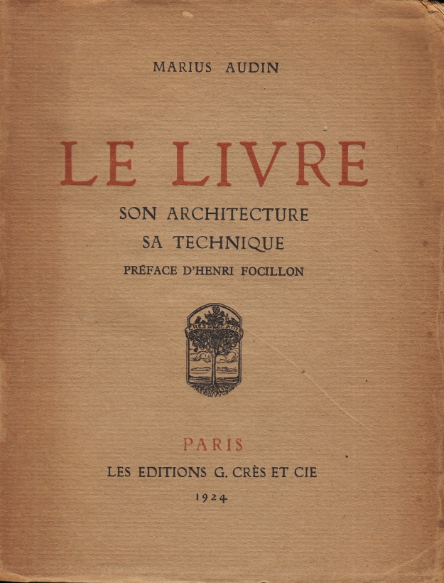 47. (KRIMPEN, van). AUDIN, Marius Le livre. Son architecture, sa technique. Preface de Henri Focillon. Paris, Éditions Crès, 1924. Ingenaaid. XVI, 280 p. Niet afgesneden. Geïllustreerd. Gedrukt in rood en zwart. 1e druk. Verbruind boek. Voorin in potlood de zwierige handtekening van Jan van Krimpen en het exlibris van zijn zoon Huibrecht van Krimpen. Rug verbruind en gedeukt. Omslag wat versleten.