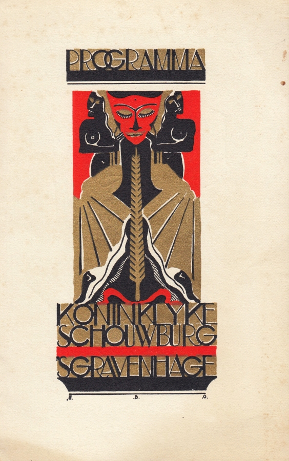 * Fraai omslagontwerp door Jeanne Bieruma Oosting gedrukt in rood, zwart en goud. Theaterprogramma voor ‘De Wonder-dancing. Een spel uit het nachtleven’ van Géza Herczeg en Karl Farkas, vertaald door Wouter Loeb en ten tonele gebracht door Cor van der Lugt Melsert.