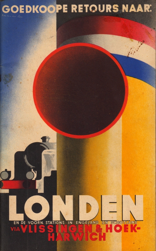 12. (CLINGE DOORENBOS, J.) Met vacantie 1938. Goedkoope retours naar Londen en de voorn. stations in Engeland en Schotland via Vlissingen & Hoek-Harwich. [Vlissingen, Stoomvaart Maatschappij Zeeland], 1938. Geniet. Omslagontwerp Kees van der Laan. 64 p. Met uitklapkaart van Groot-Brittannië. Tekstbijdragen op rijm van Clinge Doorenbos. Rijk met foto’s geïllustreerd. Wat vlekjes op het omslag, o.a. roest. Van binnen mooi.