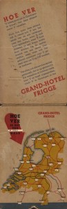 30. FRIGGE, HOTEL Afstanden van en naar Grand-Hotel Frigge, Groningen. Ingenieuze kartonnen afstandswijzer: ‘Hoe ver is het van … naar Grand-Hotel Frigge. Met draaischijf en open vakjes voor plaatsen in Nederland en kilometertallen. 28 x 9,5 cm. Grijs karton met opdruk in rood, groen en blauw. Draaischijf wat versleten, met krabbels en droedels (‘ Piet!!’). Ook met een foto van het hotel en de daarnaast gelegen bioscoop Lux, ca. 1935. Wat vlekjes en slijtage. Maar leuk!