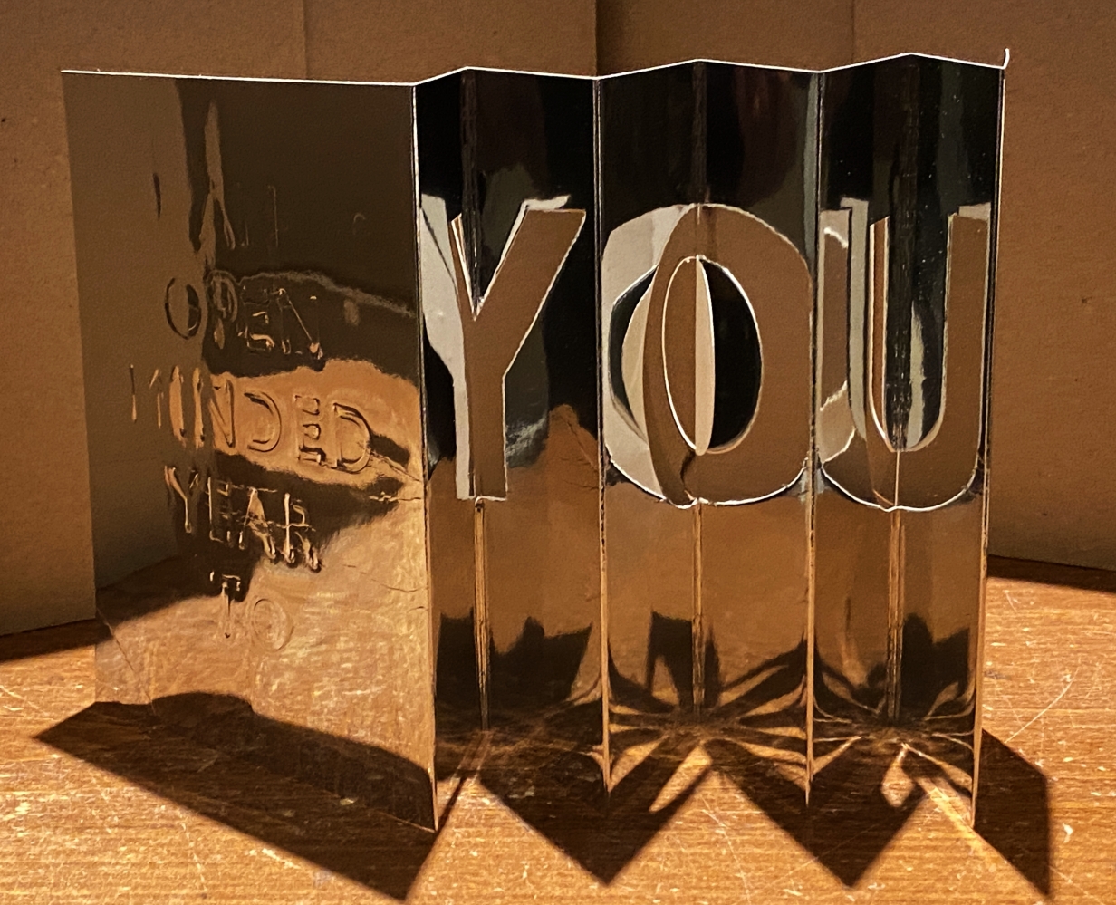 * De tekst luidt ‘An open minded year to YOU’, waarbij ‘you’ deels is uitgesneden. Fraaie, inventieve spiegelwens!