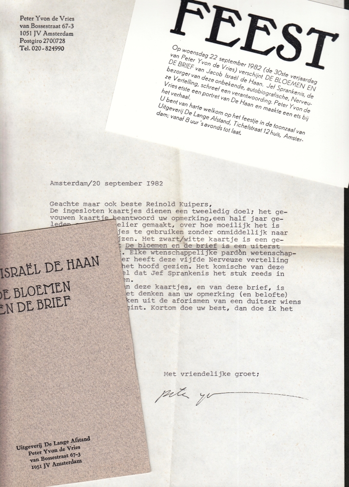 21. HAAN, Jacob Israël de De bloemen en de brief. (Met Aantekeningen van Jef Sprankenis en twee originele etsen van Peter Yvon de Vries). (Amsterdam), De Lange Afstand, 1982. Linnen met stofomslag. 20 p. Met de hand gezet uit de Hollandse Mediæval en gedrukt in groen en zwart op Velin d’Arches in een oplage van 60 genummerde exemplaren. 1e druk.