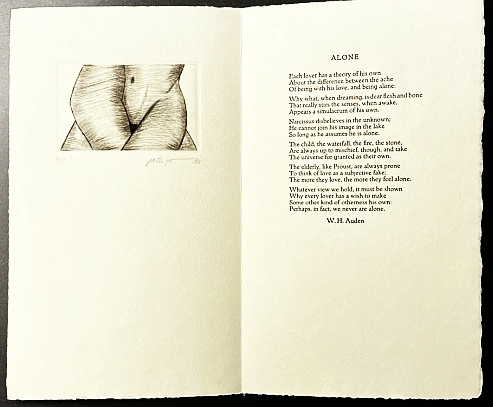 2. AUDEN, W.H. Alone. (With a drypoint etching by Peter Yvon de Vries). Amsterdam, De Lange Afstand, 1983. Vouwblad. Met de hand gezet uit de Egmont en gedrukt op handgeschept papier in een oplage van slechts 15 genummerde exemplaren.