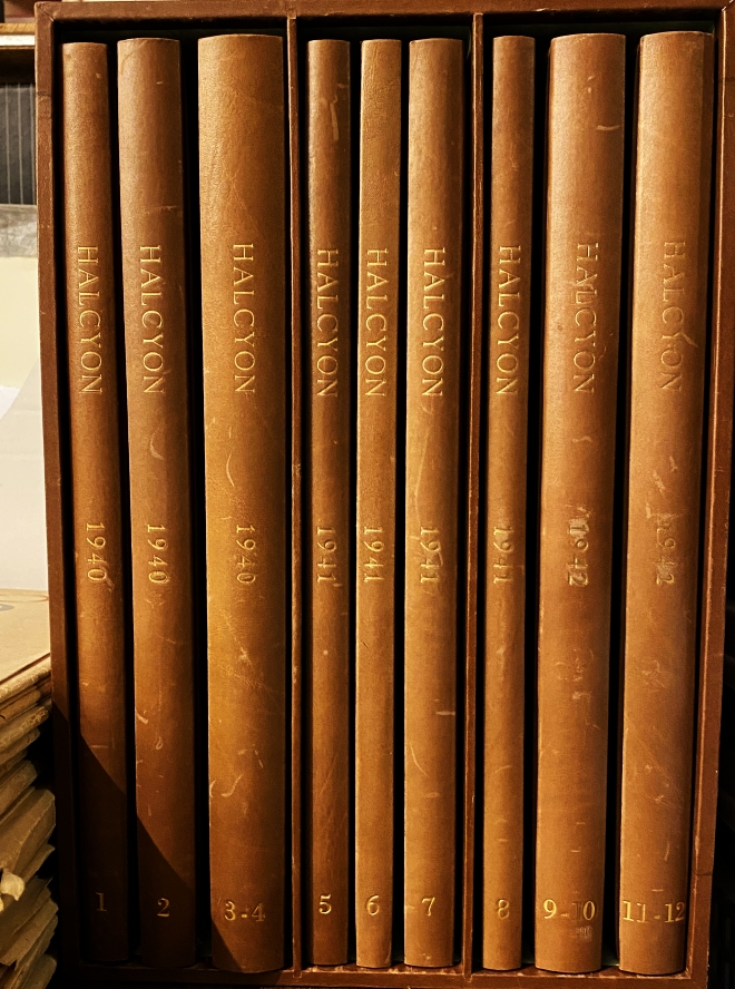 27. HALCYON Halcyon. Driemaandelijksch Tijdschrift voor Boek- Druk- en Prentkunst. Maastricht, A.A.M. Stols, 1940-1942. Aflevering 1-12. Fraai gebonden in negen halflederen banden in cassette. Voorzijden en ruggen originele omslagen meegebonden. Ruggen minimaal verkleurd, maar een mooie set.
