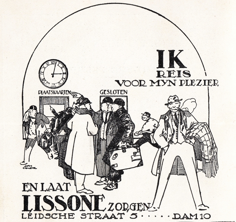 * Reclame voor de zeep- en eau-de-colognefabriek Sanders & Co. te Leiden. ‘Leg de August op uw vlakke hand en hij toont u het volgende: Beweegt de August zich alleen met het hoofd, dan zijt gij in het drinken matig’ – en drie andere mogelijkheden. De folie krult op onder invloed van de warmte van de huid. Werkt na meer dan honderd jaar nog altijd even goed. Bijzonder teer, en zeer inventief!